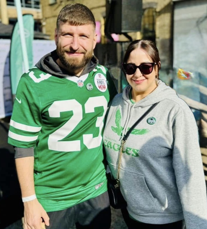 “I would say it’s pretty chill when it comes to different teams in our household; Laura has a soft spot for the Jets due to how I was treated during my award as IFOTY, something she was able to experience with me. She has seen firsthand the passion Jets fans have at Gang Green UK and Gotham City Crew events and just wants to see the Jets do well for all their fans; as long as it doesn’t affect her beloved Eagles, she will happily root for NY wins. As for me, I am similar; I will happily root for an Eagles team as long as it has no effect on my team at all. When it comes to the Jets vs. Eagles games, it can be pretty emotional in the household, though we are used to it, as she is a Liverpool FC fan and I am a Man Utd fan, so the rivalry, when it does happen, is always fun. It does, however, as a Jets fan, suck to be watching her every year get excited about the playoffs and enjoying Super Bowl runs, something I can only hope one day I get to experience. Hopefully a soon-to-come Super Bowl appearance is a Jets v. Eagles encounter so we can experience it together at whatever stadium that may be in.”
