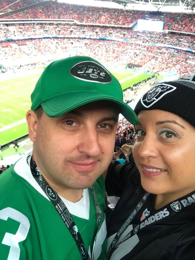Kimmi told me, “We’ve coexisted pretty well as rivals because no matter what stick he’s tried to give me, I’ve just come back with, ‘Well, we have three Super Bowls.’ Doesn’t matter that our last Super Bowl was over four decades ago; it’s two more and still more recent than the Jets’ 1969 Tiffany win! Hahaha! With our teams being in the same conference but different divisions, we play each other quite often, six times since I started following the NFL and the Raiders (from 2014), and in that time, the Silver and Black have a 4-2 winning record against Gang Green. Of those six matchups, we’ve been to two live games—the MetLife in ‘19, where we lost on my actual birthday (devastating) and Allegiant Stadium in ‘23, where we got the W. The other games have been watched on telly, and we’re that invested in seeing the other be more miserable than usual; we even managed to watch a matchup while away in Barcelona back in ’17. I can’t remember who won that time, but I’m going to say the Raiders, as let’s be honest, that’s the most likely outcome! I have to admit that I’m coming across quite mean here, but there is nothing but love. When we’ve not played each other, I’ve cheered for the Jets and he’s rooted for the Raiders. Nonetheless, you’ve never found either of us wearing the other’s team colours; that’s a step too far! We were at MetLife for a Jets vs. Colts game, and I wore my team colours with pride, which meant I stood out like a sore thumb—I got a few boos but also some fist bumps. I will say that both the Jets and Raiders fans we’ve met in the States have always been welcoming, and always curious as to why we’re a house divided.”
